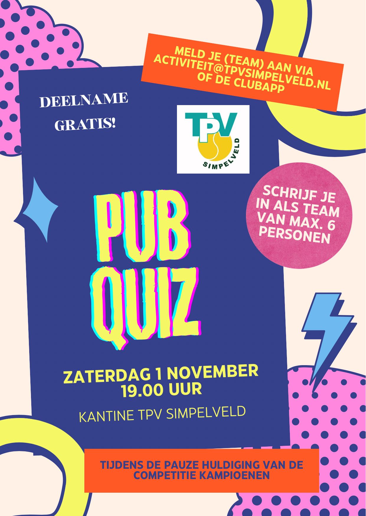 De Pubquiz van TPV Simpelveld, tevens de laatste activiteit die gepland staat op de kalender van dit jaar, vindt plaats op zaterdag 1 november en start om 19:00 uur. Gedurende dit weekend (31-10 t/m 02-11) vindt ook al het Padel Toernooi plaats. De Pubquiz zal de zaterdagavond gezellig afsluiten, dus als je je al hebt ingeschreven voor het Padel Toernooi, neem dan ook nog gezellig deel aan de Pubquiz om je dag gezellig én competitief af te sluiten.